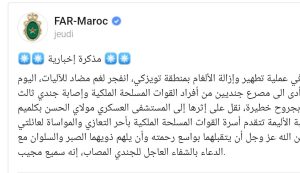 وعبّرت القوات المسلحة الملكية عن أحر تعازيها ومواساتها لعائلات الجنديين المتوفين، سائلة الله أن يتغمدهما بواسع رحمته، وأن يلهم ذويهما الصبر والسلوان. كما أعربت عن تمنياتها بالشفاء العاجل للجندي المصاب.