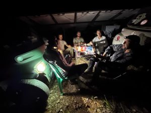 مع نهاية اليوم، توقفت القافلة في قرية صغيرة على بُعد 370 كيلومترا من العاصمة الكونغولية برازافيل. السكان المحليون استقبلوا الفريق بكرمهم المعتاد، حيث شاركوا الطعام بتوابله المحلية والقصص المثيرة والشيقة..في سمر ليلي دافئ.