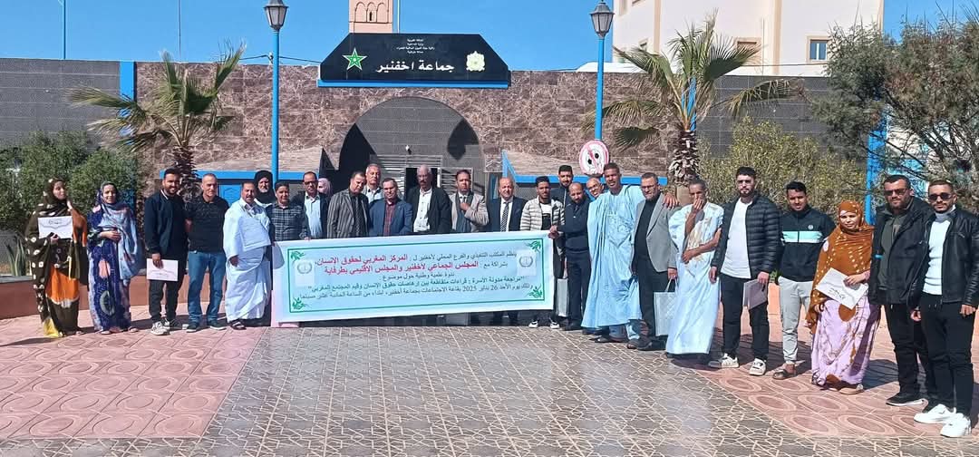 نظم الفرع المحلي للمركز المغربي لحقوق الإنسان، يوم الأحد 26 يناير 2025، بقاعة الاجتماعات لجماعة أخفنير التابعة لإقليم طرفاية، ندوة علمية وطنية تحت عنوان: “مراجعة مدونة الأسرة: قراءات متقاطعة بين إرهاصات حقوق الإنسان وقيم المجتمع المغربي”.