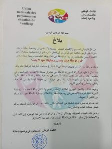 وطالب الاتحاد، في بلاغه، بـ”التفعيل الفوري لبطاقة الإعاقة وتضمينها لكامل سلة الخدمات”، مع الدعوة إلى اعتماد “منحة شهرية تحفظ كرامة الأشخاص في وضعية إعاقة”، مؤكدًا على أن المطالب المطروحة “عادلة ومشروعة، ولا تقبل التأخير أو التسويف”.