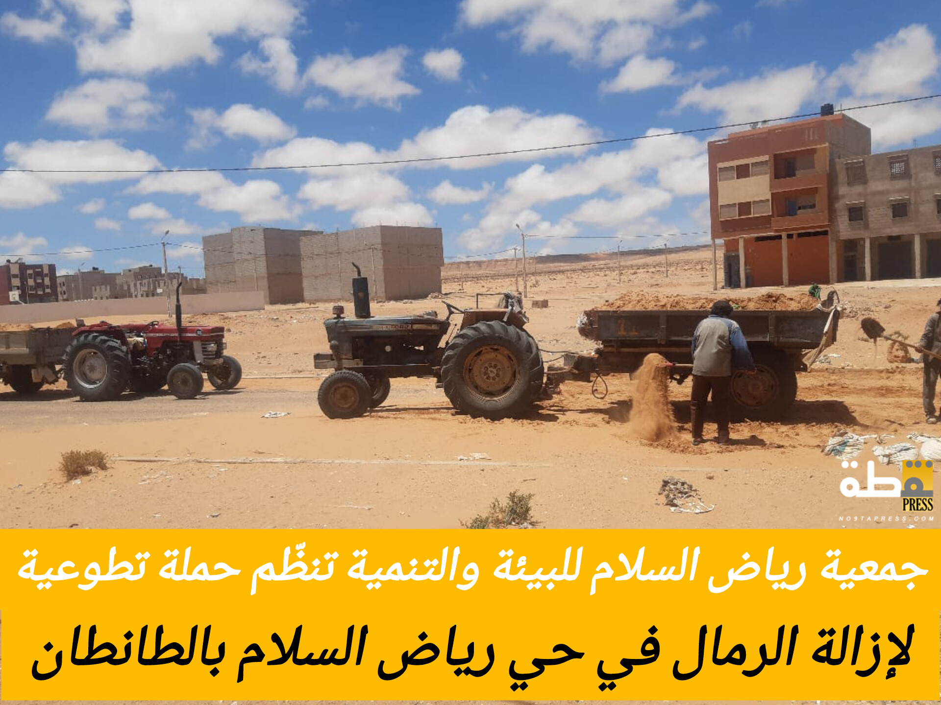 في إطار جهودها المستمرة لتحسين البيئة الحضرية والحد من المخاطر الطبيعية، أشرفت جمعية رياض السلام للبيئة والتنمية على إطلاق حملتها التطوعية الثانية لإزالة الرمال المتراكمة في الشوارع والأزقة بحي رياض السلام بمدينة الطانطان.