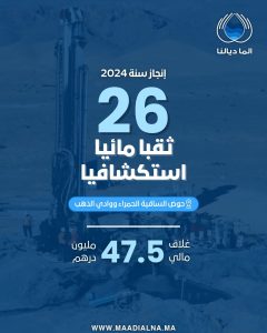 وقد تم إنجاز 26 ثقبا مائيا استكشافيا بالحوض سنة 2024، بعمق إجمالي بلغ 7050 متراً. ويعكس ذلك حجم المجهودات المبذولة لاستكشاف الموارد المائية الجوفية في المناطق التابعة لنفوذ الوكالة.