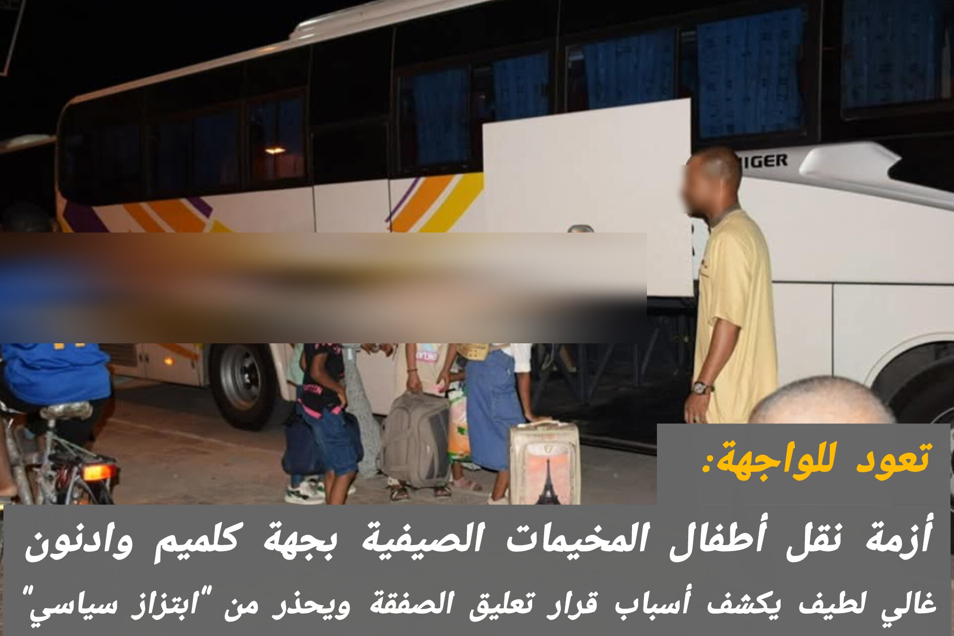 في تطور جديد يعيد إلى الواجهة إشكالية النقل التربوي بجهة كلميم وادنون، أعلن رئيس المكتب الجهوي للجامعة الوطنية للتخييم، السيد غالي لطيف، عن توجه المكتب نحو إلغاء صفقة نقل أطفال المخيمات الصيفية برسم سنة 2025، مرجعًا ذلك إلى “العشوائية في تدبير هذا الملف، وابتزاز يمارسه بعض أعضاء مجلس الجهة بغرض تمرير جمعيات سياسية محسوبة على أحزابهم للاستفادة من خدمات النقل، دون احترام المعايير التربوية المعتمدة”.
