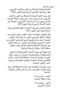 كما جدد الطرفان تأكيدهما على الإرادة السياسية المشتركة من أجل بناء رؤية موحدة للرخاء، ترتكز على قيم السلام والأمن والتنمية الشاملة، وتعكس الطموح المشترك لتوطيد العلاقات بين ضفتي المتوسط.