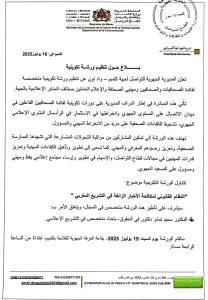 في إطار حرصها على تأهيل الكفاءات الإعلامية وتعزيز قدرات الفاعلين في قطاع الصحافة والتواصل، تعلن المديرية الجهوية للتواصل لجهة كلميم وادنون، التابعة لوزارة الشباب والثقافة والتواصل ـ قطاع التواصل، عن تنظيم ورشة تكوينية متخصصة لفائدة الصحافيات والصحافيين ومهنيي الإعلام بالجهة.