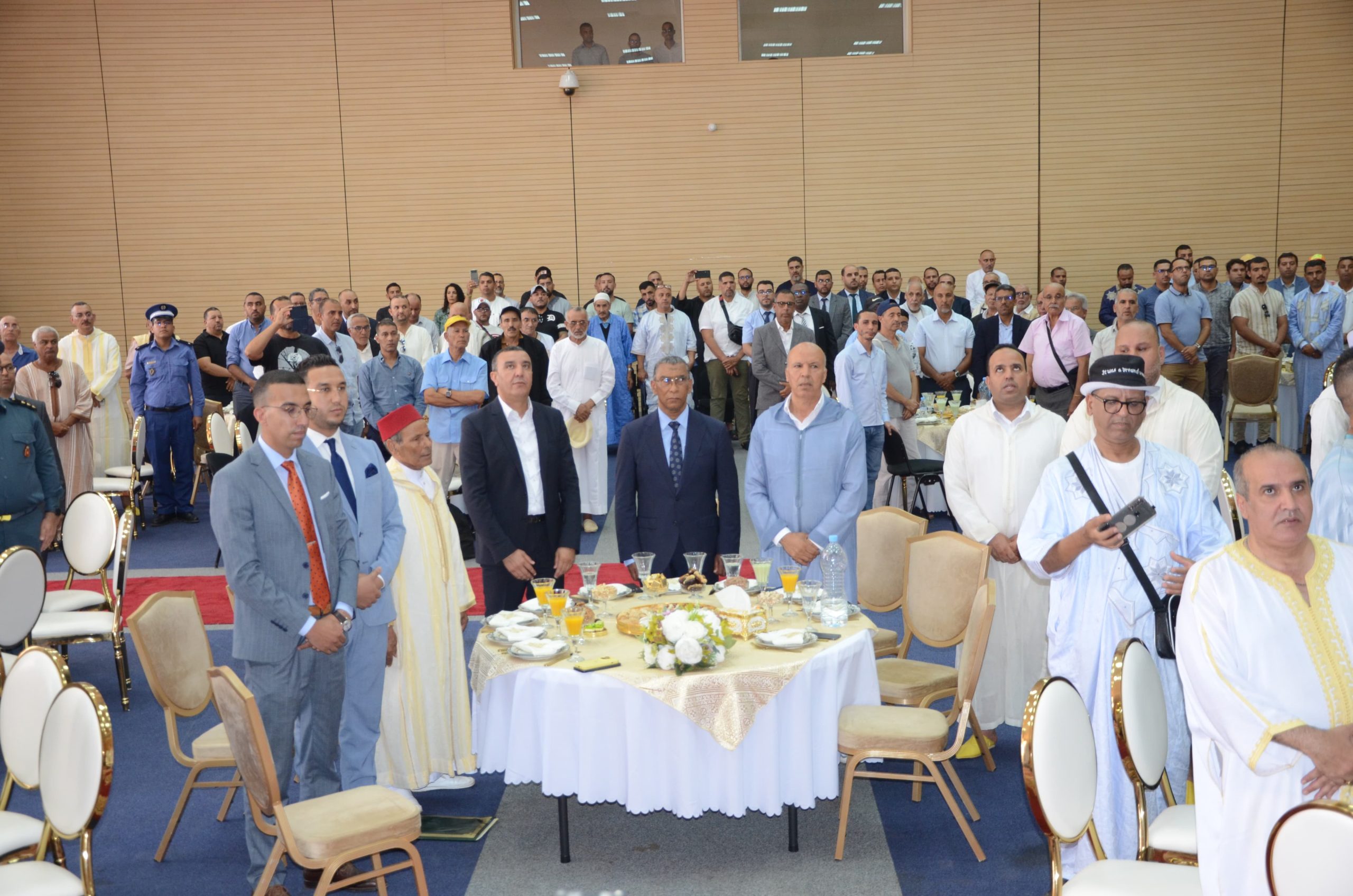 افتُتح اللقاء بتلاوة آيات بينات من الذكر الحكيم، ووقوف تحية للعلم الوطني، قبل أن يتوجه السيد العامل بكلمة رحب فيها بالمحتفى بهم، متمنياً لهم إقامة طيبة بين أهاليهم وذويهم. وشكرهم على تلبية الدعوة لحضور فعاليات اليوم الوطني الذي نظم هذه السنة تحت شعار: “ورش الرقمنة: تعزيز لخدمات القرب الموجهة لمغاربة العالم”.