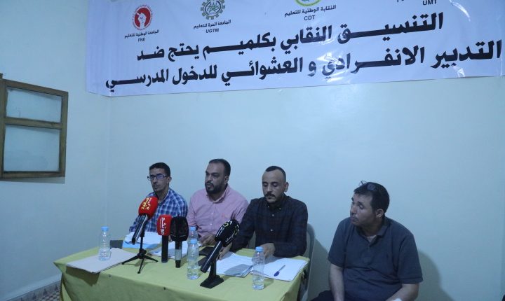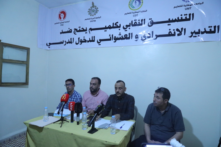 عقد التنسيق النقابي الرباعي للتعليم بإقليم كلميم، المكوّن من النقابة الوطنية للتعليم CDT، الجامعة الوطنية للتعليم FNE-UMT، الجامعة الحرة للتعليم UGTM، والجامعة الوطنية للتعليم FNE التوجه الديمقراطي، يوم الأربعاء 8 أكتوبر 2025 ندوة صحفية بمقر الكونفدرالية الديمقراطية للشغل بساحة بئرانزران بكلميم، على الساعة الثامنة مساء، لتسليط الضوء على الوضع التعليمي بالإقليم في مستهل الدخول المدرسي 2025-2026.