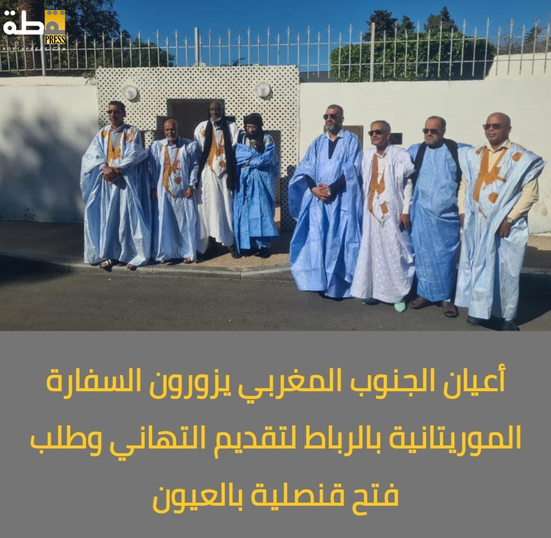 قامت مجموعة من أعيان قبائل الجنوب المغربي ذات الامتداد الشنقيطي، من مزدوجي الجنسية المغربية والموريتانية، زوال اليوم الأربعاء، بزيارة رسمية إلى مقر السفارة الموريتانية بالرباط، وذلك لتقديم التهاني إلى الحكومة والشعب الموريتاني بمناسبة الاحتفال بذكرى عيد الاستقلال الوطني.