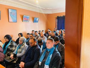 وقد استُهل هذا اللقاء بتلاوة آيات بينات من الذكر الحكيم بصوت الأستاذ محمد السومي، تلتها مراسيم أداء النشيد الوطني ونشيد الاتحاد، قبل أن تُلقى كلمة توجيهية باسم المكتب الإقليمي قدمها المتصرف التربوي كريم أدبيرا، أبرز خلالها أهمية التنظيم النقابي في الدفاع عن حقوق نساء ورجال التعليم وانتزاع المكتسبات.