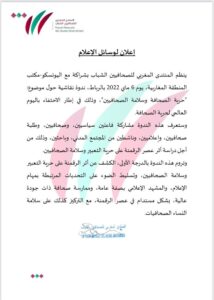احتفاء باليوم العالمي لحرية الصحافة، ينظم المنتدى المغربي الصحافيين الشباب بشراكة مع منظمة اليونسكو، مكتب المنطقة المغاربية، ندوة حول: حرية الصحافة وسلامة الصحافيين، يوم 6 ماي الجاري.