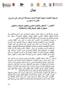 على إثر مصادقة كل من مجلس النواب ومجلس المستشارين على “مشروع القانون رقم 25.19 المتعلق بالمكتب المغربي لحقوق المؤلف والحقوق المجاورة”، وعقب عدة اجتماعات للتداول في الموضوع، تعبر تنسيقية النقابات الفنية المهنية عما يلي:
