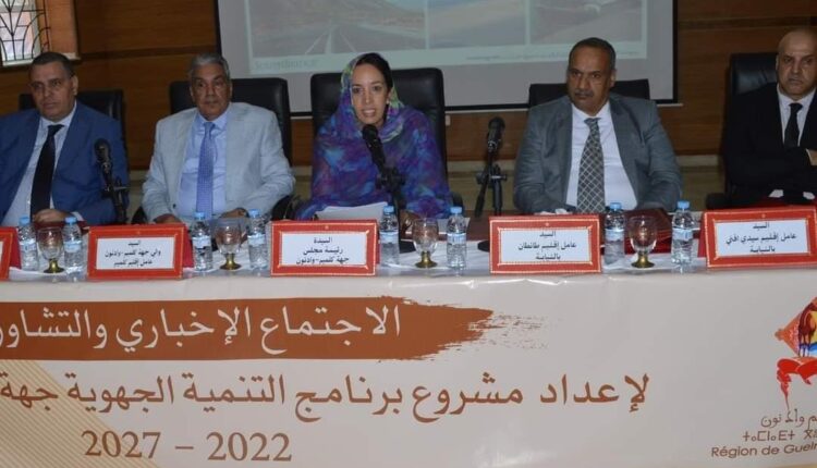 عقد مجلس جهة كلميم وادنون اجتماعا اخباريا وتشاوريا لإعطاء انطلاقة إعداد برنامج التنمية الجهوية لجهه كلميم وادنون للفترة 2022-2027 ، اليوم الثلاثاء 30 غشت 2022 بقاعة الاجتماعات الكبرى بمقر الجهة برئاسة رئيسة مجلس الجهة والسيد والي الجهة والسادة عمال والكتاب العامين لأقاليم الجهة ورؤساء المصالح الجهة والمنتخبين.
