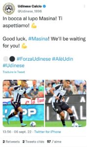 وكان ماسينا البالغ من العمر 28 عاما انتقل إلى أودينيزي خلال فترة الانتقالات الصيفية الأخيرة قادما من واتفورد الإنجليزي، بعدما وقع على عقد مدته 3 سنوات، ينتهي صيف 2025.