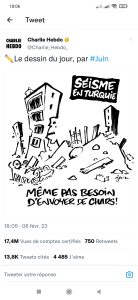 ونشرت صحيفة شارلي إبدو عبر حسابها في تويتر كاريكاتيرا بعنوان “رسم اليوم”، وأظهر عددا من المباني المدمرة بفعل الزلزال في تركيا، وعلقت على الرسم “لا داعي لإرسال دبابات”.