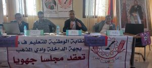 عقد المجلس الجهوي للنقابة الوطنية للتعليم العضو في الفيدرالية الديمقراطية للشغل بجهة الداخلة وادي الذهب بقاعة ادريس بن زكري بالمديرية الاقليمية الداخلة يوم الاحد 26 فبراير 2023 . حيث توزعت المداخلات بين الكاتب الجهوي للنقابة الذي تطرق فيها لمحصلة عمل المكتب طيلة النصف الاول من الموسم الدراسي ؛ ثم مداخلة عضو المجلس الوطني التي قدم فيها المستجدات الوطنية ؛ لتأتي بعدها مداخلة الكاتب الاقليمي لأوسرد والتي تطرق من خلالها الى المشاكل التي يعاني منها اساتذة هذا الاقليم ؛ ليقدم بعدها امين المال تقريره المالي ؛ وبعد فتح باب النقاش و التداول في مضمون المداخلات ؛ تم تشكيل سكرتارية الإدارة التربوية و دائرة المرأة؛ ليختتم اللقاء بكلمة شكر من المكتب الجهوي لمنخرطيه و للحضور بصفة عامة.