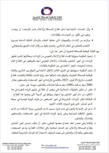 • واعتبارا للتلكؤ الذي أبدته العديد من المؤسسات في الصحافة المكتوبة والإلكترونية في تطبيق الزيادات التي أقرها الاتفاق الاجتماعي المشترك الموقع بين النقابة الوطنية للصحافية المغربية وممثلي الناشرين، والذي تضمن زيادة صافية في أجور الصحافيات والصحافيين والعاملات والعاملين.